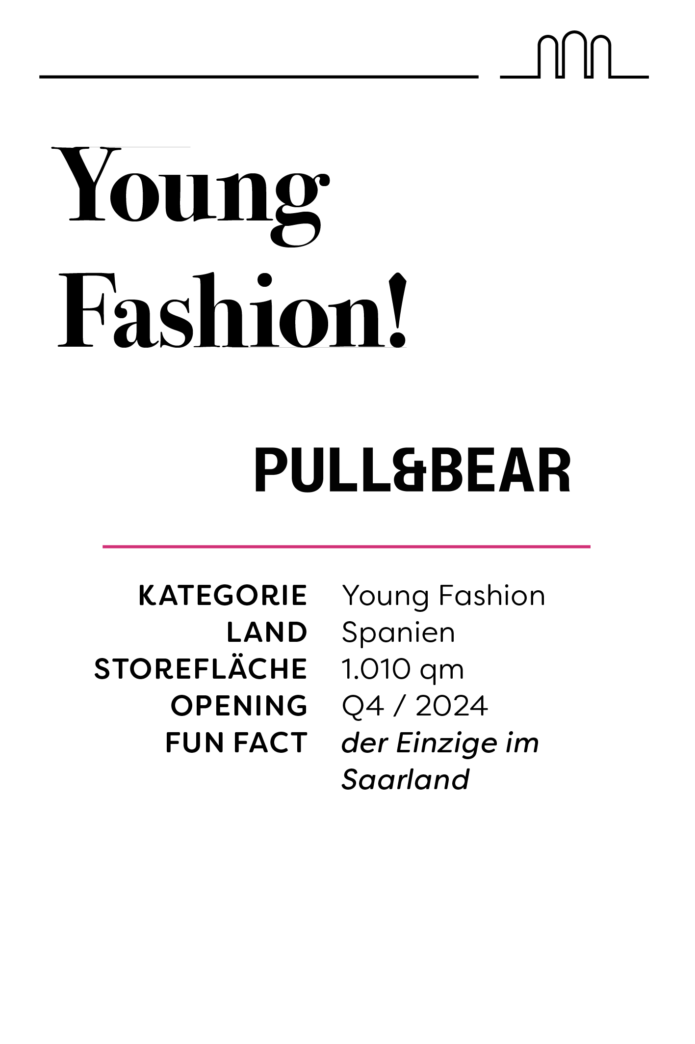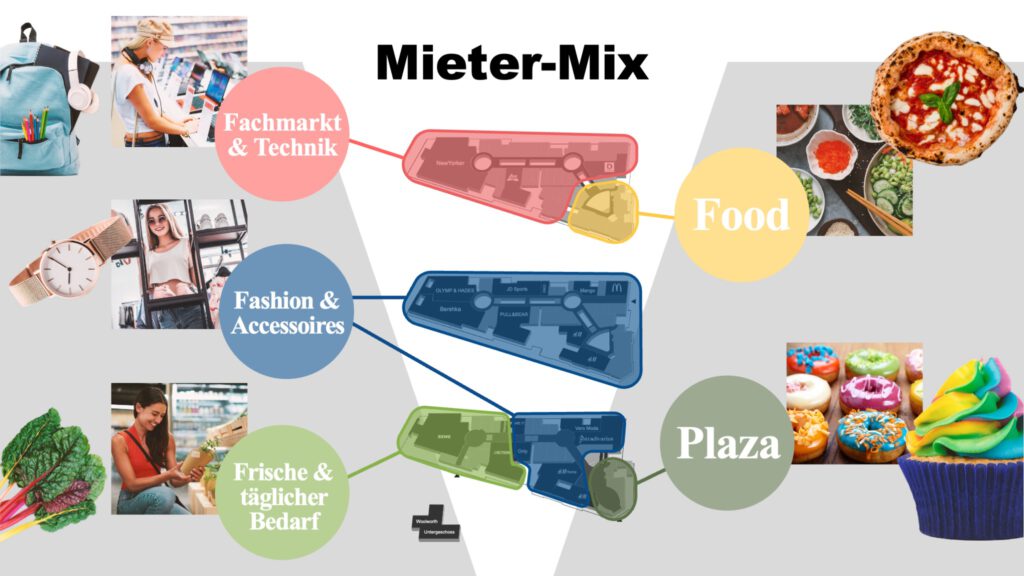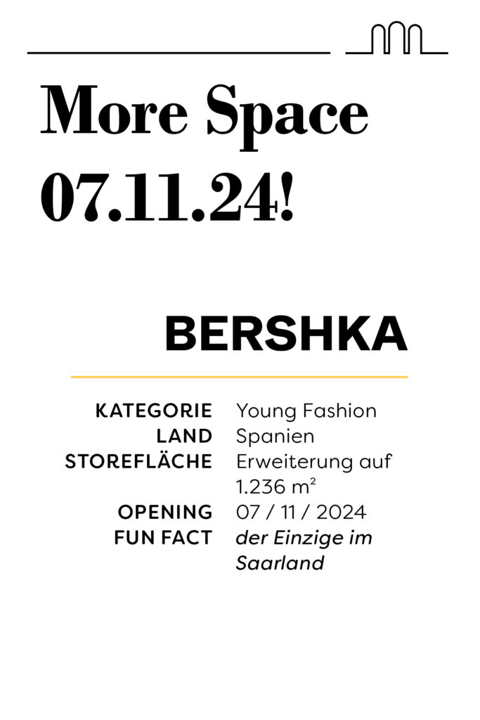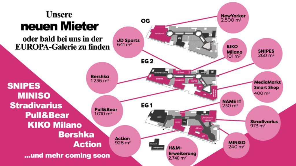 Das neue Konzept sieht eine klare Strukturierung mit definierten Clustern und Nachbarschaften vor. Dies hat H&M zu einer Erweiterung um H&M Home und Bershka zu einem strategischen Umzug und einer Erweiterung ihrer Fläche auf 1.240 m² bewegt. Wir haben Pull&Bear, Stradivarius, Woolworth, Action, NAME IT und KIKO Milano als Neumieter gewonnen! Bald wird es noch zwei weitere Ankermieter zu kommunizieren geben.